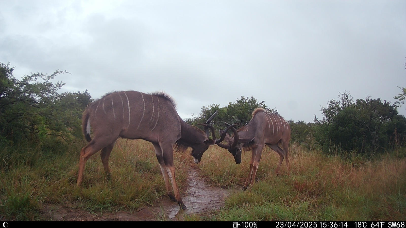 These young kudu males are engaged in a bout of sparring, a common behaviour where they practice their fighting skills and test each other's strength without serious intent. This spontaneous moment, witnessed only by the camera trap, gives us a rare, intimate look at their growth and social dynamics.