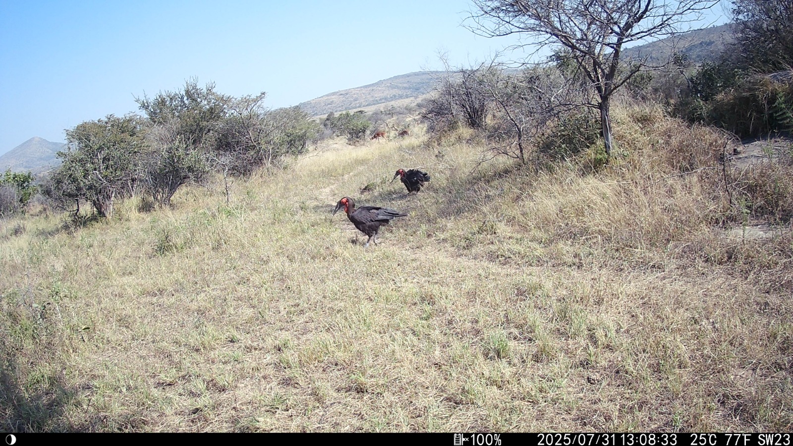 The Southern Ground Hornbill is one of the largest and most distinctive birds in the reserve. They are vital ecological indicators and breed cooperatively, with the dominant pair being assisted by several helpers in raising usually just a single chick.